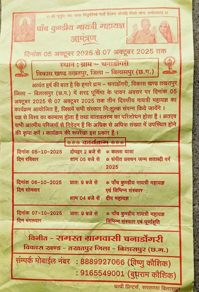 बिलासपुर। तखतपुर विधानसभा क्षेत्र अंतर्गत आने वाले ग्राम पंचायत चनाडोंगरी में शरद पूर्णिमा के अवसर पर 5 अक्टूबर से 7 अक्टूबर तक तीन दिवसीय गायत्री महायज्ञ का कार्यक्रम आयोजित किया गया है। उक्त कार्यक्रम की जानकारी देते हुए गायत्री परिवार के पदाधिकारि विष्णु प्रसाद कौशिक ने बताया कि यहां महायज्ञ कार्यक्रम में सभी संस्कार निशुल्क संपन्न किये जायेंगे और यह यज्ञ से विश्व का कल्याण होता है तथा वातावरण का परिशोधन होता है। इस प्रकार यज्ञ कार्यक्रम 5 अक्टूबर को दोपहर 2 बजे से कलश महायात्रा और शाम 5 बजे से संगीत प्रवचन, जन्म शताब्दी वर्ष एवं 6 अक्टूबर को सुबह 9 बजे से पांच कुण्डीय गायत्री महायज्ञ एवं विभिन्न संस्कार और शाम 4 बजे से दीप महायज्ञ कार्यक्रम होगा तथा 7 अक्टूबर को सुबह 9 बजे से पांच कुण्डीय गायत्री महायज्ञ एवं विभिन्न संस्कार व पूर्णाहुति होगी।