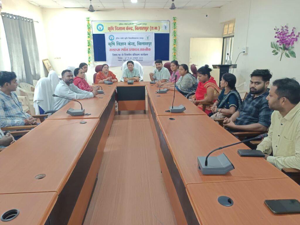 बिलासपुर । कृषि विज्ञान केंद्र बिलासपुर के वरिष्ठ वैज्ञानिक एवं प्रमुख डॉ गीत शर्मा के मार्गदर्शन में दो दिवसीय प्रशिक्षण का आयोजन किया गया। इस दो दिवसीय प्रशिक्षण कार्यक्रम के दौरान मशरूम स्पॉन उत्पादन से संबंधित विभिन्न विषयों जैसे शुद्ध कल्चर एवं व्यावसायिक मशरूम स्पॉन उत्पादन, प्रयोगशाला में विभिन्न उपकरणों का उपयोग एवं सावधानियां, मशरूम स्पॉन इकाई के लिए उद्यमिता के अवसर और लागत लाभ विश्लेषण इत्यादि पर तकनीकी एवं प्रायोगिक प्रशिक्षण प्रदान किया गया। उपरोक्त प्रशिक्षण कार्यक्रम कृषि विज्ञान केंद्र के सम्पन्न हुआ । उक्त प्रशिक्षण कार्यक्रम में कृषि विज्ञान केंद्र के समस्त वैज्ञानिक गण डॉ शिल्पा कौशिक, जयंत साहू, डॉ. एकता ताम्रकार, हेमकांति बंजारे, इंजी. पंकज मिंज, डॉ निवेदिता पाठक, डॉ स्वाति शर्मा एवं डॉ. चंचला रानी पटेल ने कृषक प्रशिक्षणार्थियों को संबंधित विषयों की विस्तारपूर्वक तकनीकी जानकारी प्रदान की। उक्त प्रशिक्षण कार्यक्रम में कृषि विज्ञान केन्द्र के मशरूम उत्पादन ईकाई की संपूर्ण जानकारी दी गई।केन्द्र के सफल कृषकों द्वारा अपनाए जा रहे मॉडल की भी जानकारी दी गई।कुल 25 कृषक प्रशिक्षणार्थियों ने सफलता पूर्वक भाग लिया।